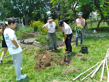 4. Fill in Dirt. Place dirt over and around it. Don’t add anything to the dirt you’re going to put back into the hole to cover the tree roots — not peat moss, not fertilizer. It does more harm than good to spot fertilize a newly planted tree. This is because it tends to make the soil around the tree roots of a significantly different composition from the soil next to it. Water doesn’t move normally across the difference. The result is a tree that’s liable to be abnormally wet, or too dry. Don’t bury incompletely decomposed organic litter around the seedling tree either. This can mess up the pH, the nutrient balances and the populations of microscopic soil creatures. On the other hand, fully composted organic material that is evenly distributed across the top of the ground in your young tree’s area could be helpful. Stomp dirt all around it to be firm and create a depression into which water can settle.
